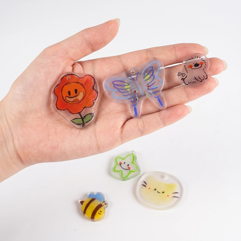 Ostin nämä kutistemuovit koulun kuvataidekerhoa varten. Jopa ujoimmat lapset avautuivat, kun he vertailivat luonnoksiaan ja vaihtoivat valmiita riipuksia luokkakavereiden kanssa.