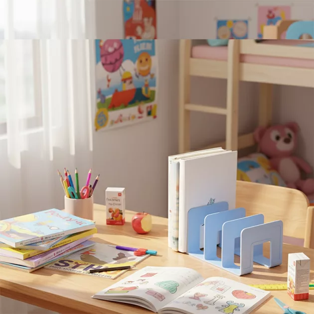 Tämä kirjateline auttoi minua lopettamaan vihkojen hukkaamisen. Matematiikan tarvikkeet löytyy nopeasti, ja pöytäni näyttää joka päivä paremmalta.