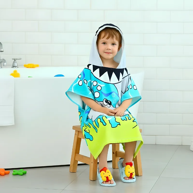 Värikkäät kuosit tekevät jokaisesta pesuhetkestä seikkailun. Pehmeä kangas pitää lapset mukavina uimisen tai kylvyn jälkeen. Käytännöllinen ponchomalli antaa liikkumavapautta ja kuivattaa nopeasti. Hupullinen malli suojaa vilulta ja peittää märät hiukset.