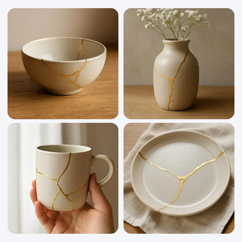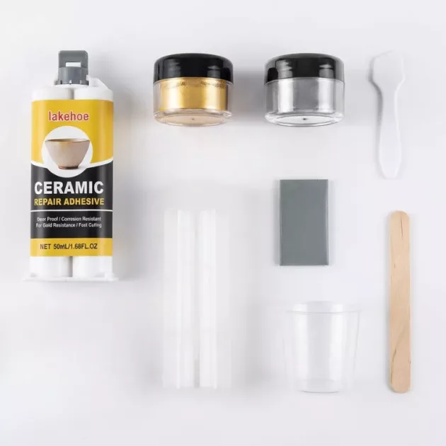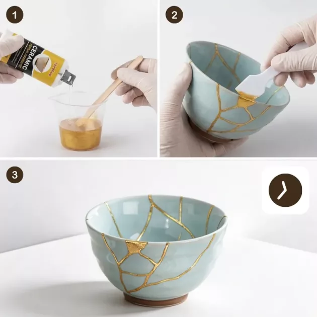 Käytin tätä keramiikkasettiä kaksosteni kanssa sateisena sunnuntaina. He paikkaisivat huolellisesti kaksi lohjenneita kulhoa ja muuttivat ne kimalteleviksi muistoesineiksi, joita käytämme nyt päivittäin.
