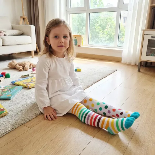 Lapset rakastavat liikkua ja leikkiä joka päivä. Nämä sukkahousut tuovat lisäiloa hauskoilla kuvioilla ja rohkeilla väreillä. Pehmeä, joustava kangas pitää jalat ja varpaat lämpiminä seikkailujen aikana. Vanhemmat arvostavat helppoa pukemista ja vähemmän säätöä kotona.