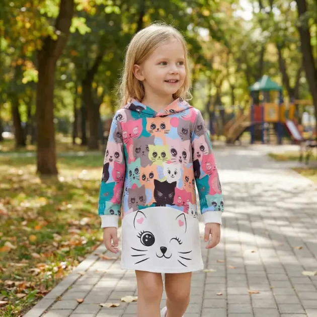 Tämä mekko on todella helppo lapseni pukea itse. Hän kokee olonsa itsenäiseksi ja rakastaa hauskaa huppua.