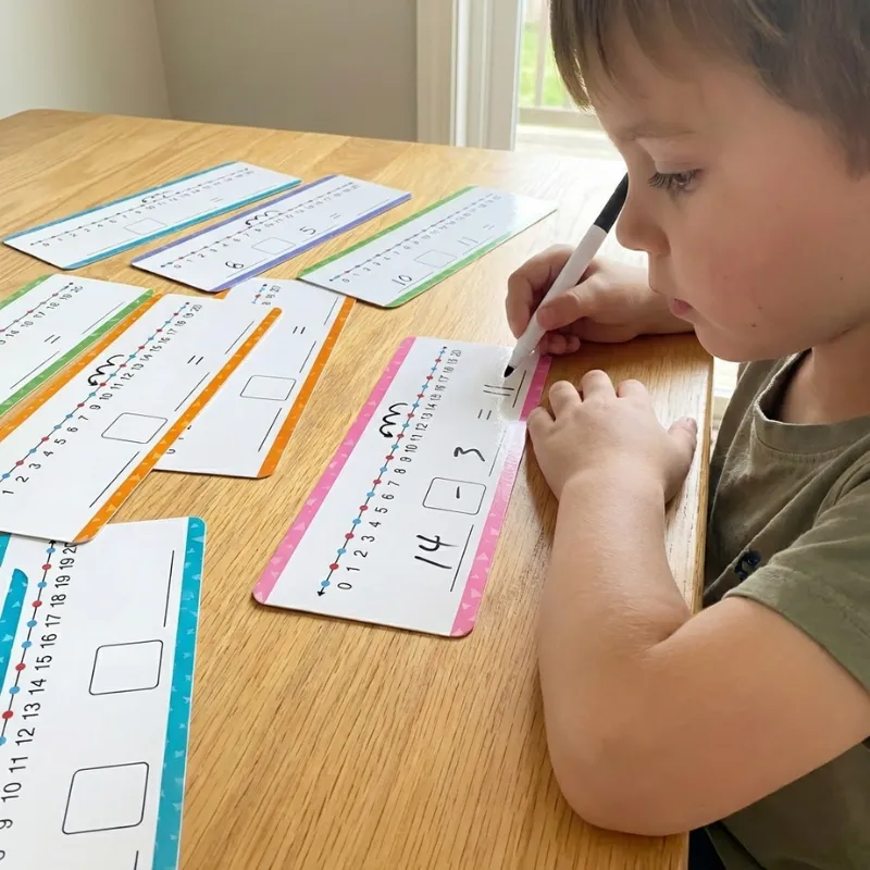 Käytän kortteja tyttäreni kanssa joka ilta. Pienet askeleet jokaisella puolella auttavat häntä pysymään rauhallisena numeroiden kanssa ja jopa nauttimaan laskujen harjoittelusta.