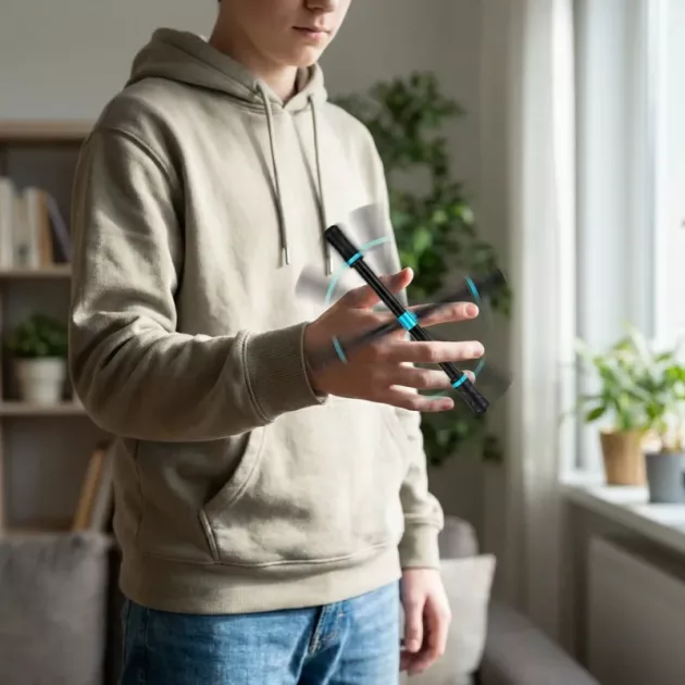 Tunnen joskus levottomuutta, mutta tämän kynän pyörittäminen antaa käsilleni tekemistä. Sopii hyvin, kun on tylsää tai pitää istua paikallaan.