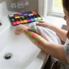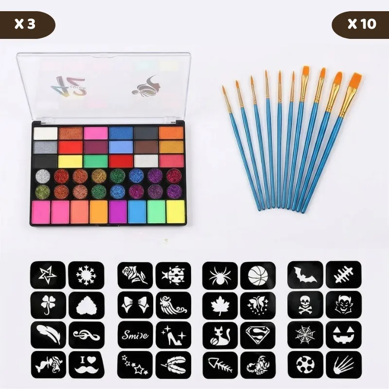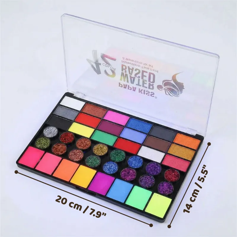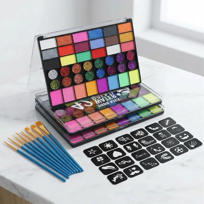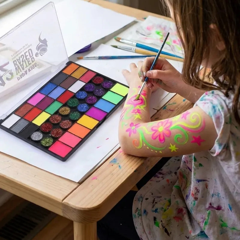 Olemme käyttäneet tätä samaa palettia useissa synttärijuhlissa, ja maalit näyttävät yhä tuoreilta. Kestävyys yllätti, kun ajattelee, kuinka helposti ne peseytyvät pois.