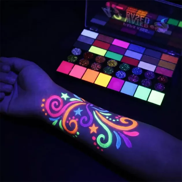 Ostin tämän maalipakkauksen tyttäreni glow-juhlia varten. Värit hehkuivat todella kirkkaasti UV-valossa ja peseytyivät helposti pois suihkussa jälkeenpäin.