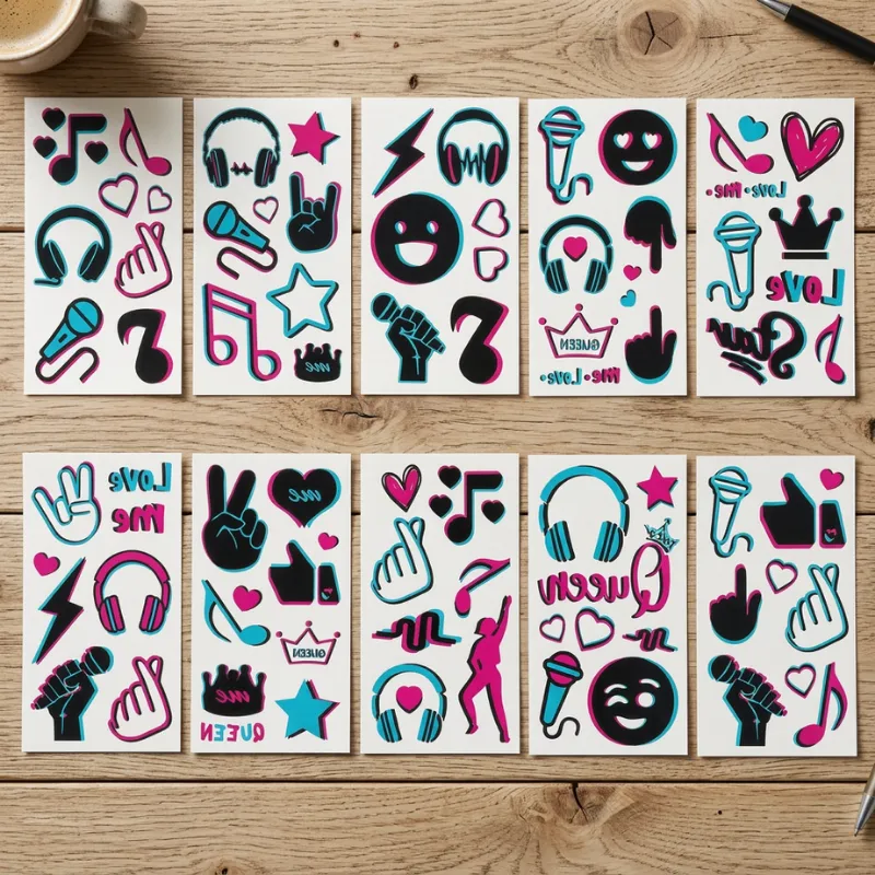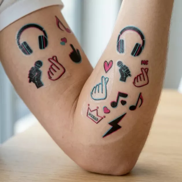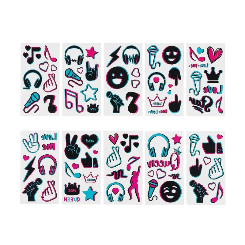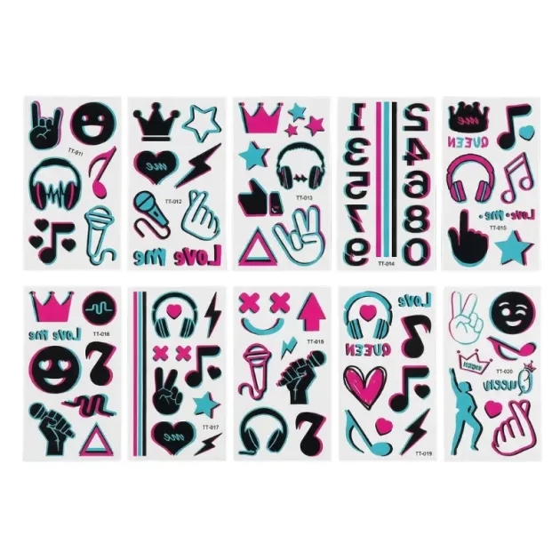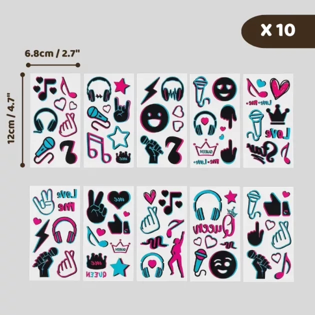 Lapset rakastavat luoda rohkeita tyylejä näillä hohtavilla tarroilla. Vanhemmat voivat olla rauhallisin mielin, sillä poistaminen on aina helppoa ja hellävaraista. Jokaisessa pakkauksessa on ainutlaatuisia kuoseja musiikin ystäville ja tanssijoille.