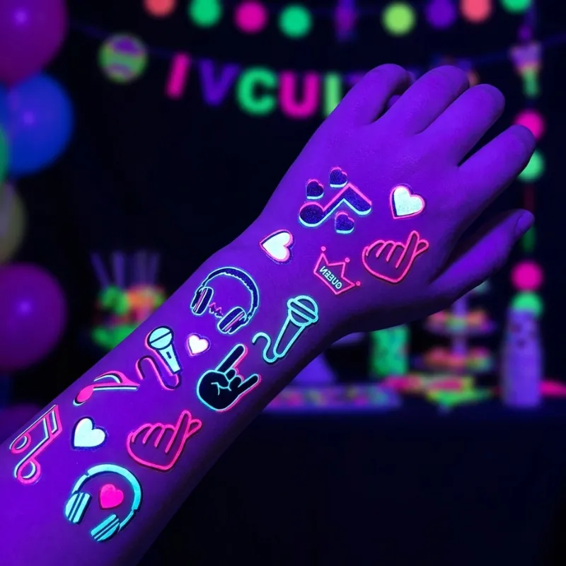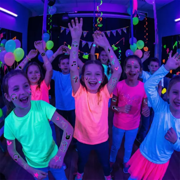Käytimme UV-tatuointeja koulun kykykilpailussa. Ne erottuivat lavalla eivätkä häirinneet heidän herkkää ihoaan lainkaan jälkeenpäin.