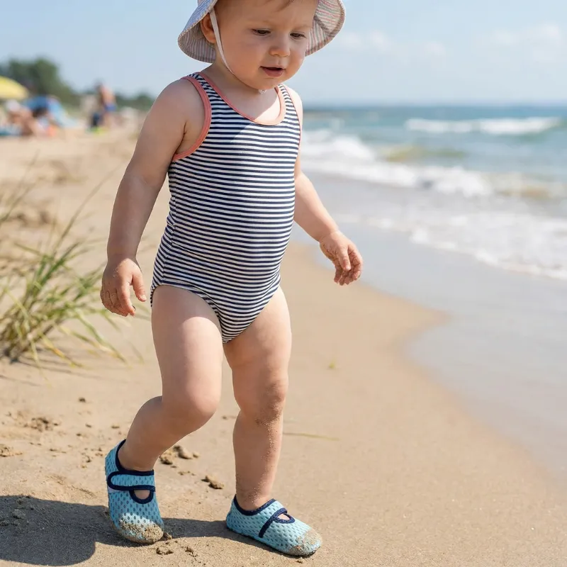 Pidän näitä rantakenkiä autossa yllätyspuistopysähdyksiä varten. Helppo pukea, remmi tuntuu hellävaraiselta, ja ilmavat sivut estävät pieniä jalkoja ylikuumenemasta.