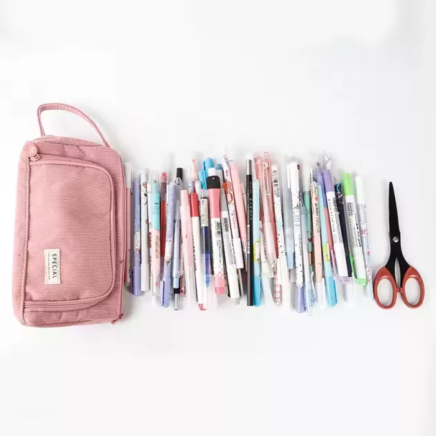 Pitää kaiken erillään, erityisesti tussit ja lyijykynät. Helppo pakata tavarat nopeasti joka tunnille.