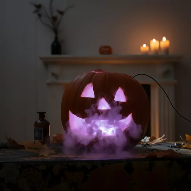 Erittäin kirkkaat värit saavat tämän kurpitsan erottumaan jopa päivällä. Sumu on pehmeää, mutta tekee suuren eron meidän kummitustaloasetelmassamme.