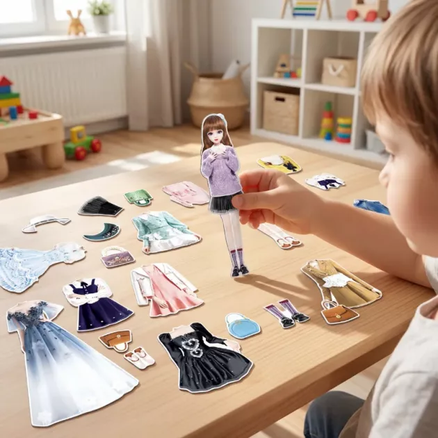 Lapset nauttivat nukkejen pukemisesta ja erilaisten asujen yhdistelystä. Jokainen leikkihetki innostaa uusiin ideoihin ja kehittää samalla itsevarmuutta ja keskittymiskykyä. Vanhemmat ilahtuvat nähdessään, kuinka lapset tutkivat turvallista, sotkutonta leikkiä. Tämä setti pitää pienet kädet kiireisinä ja mielet virkeinä tuntikausiksi.