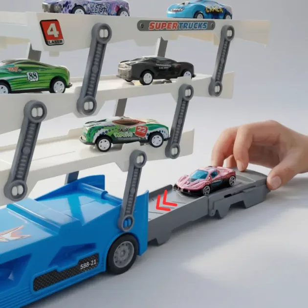 Tyttärelle on hauskaa järjestellä autot takaisin telineeseen. Leikistä tulee uusi peli joka kerta, kun hän leikkii.
