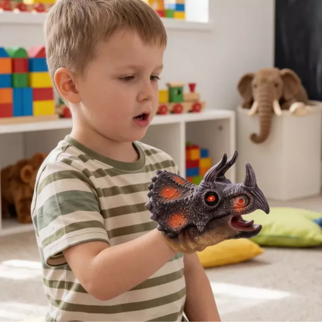 Muutimme olohuoneen “dinomuseoksi”. Lapseni esittää kysymyksiä eri lajeista samalla kun käsinukke “opastaa” kierrosta. Oppiminen tuntuu leikiltä.