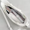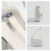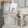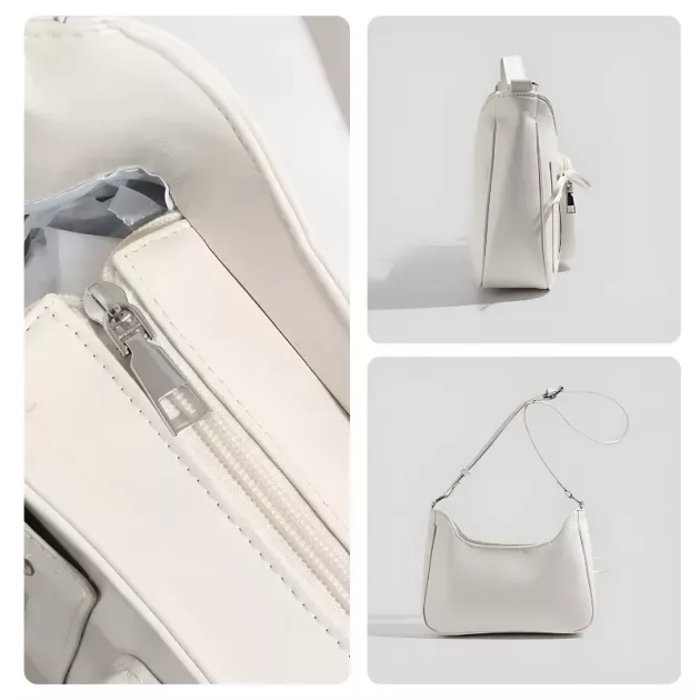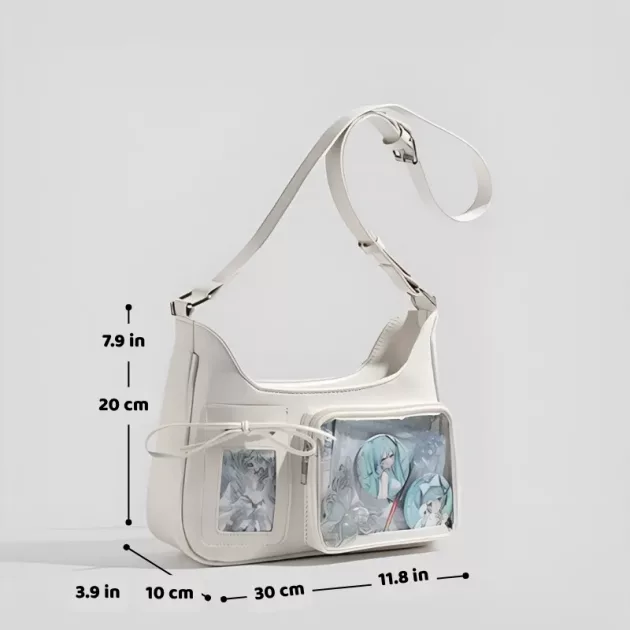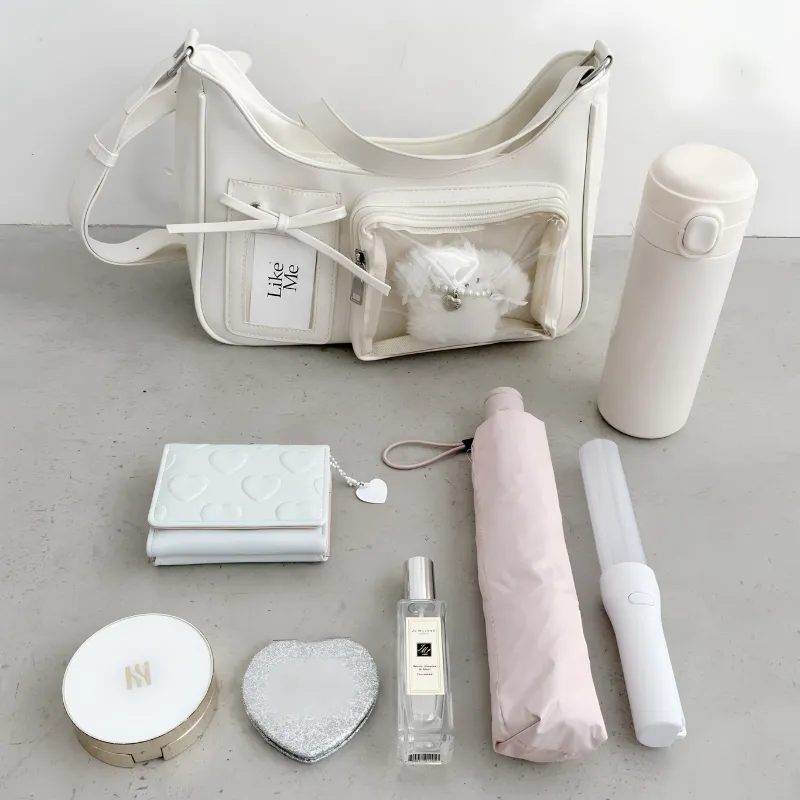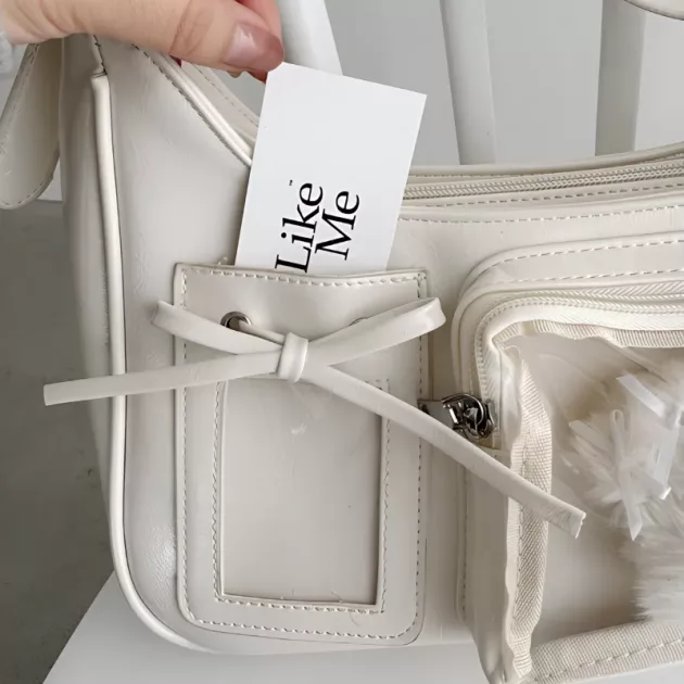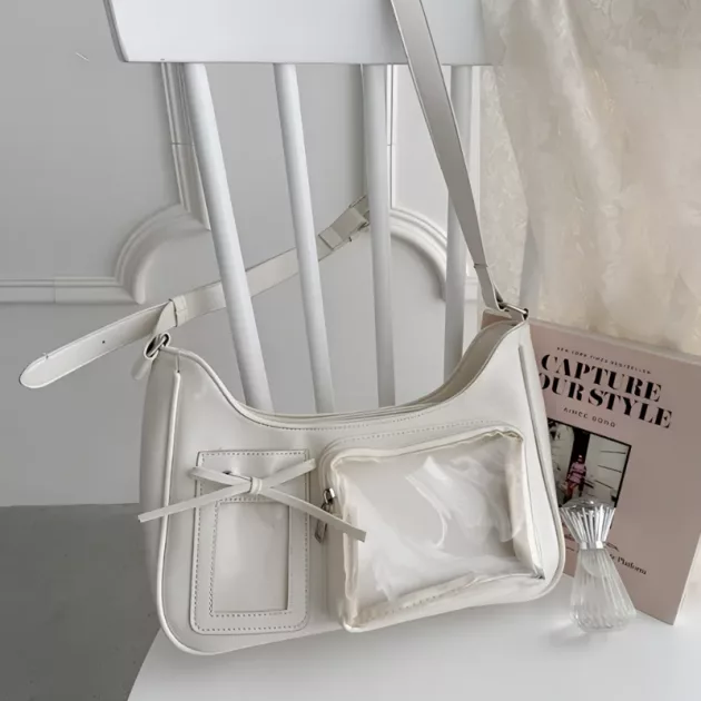 Pieni olkalaukku, jossa läpinäkyvä tasku