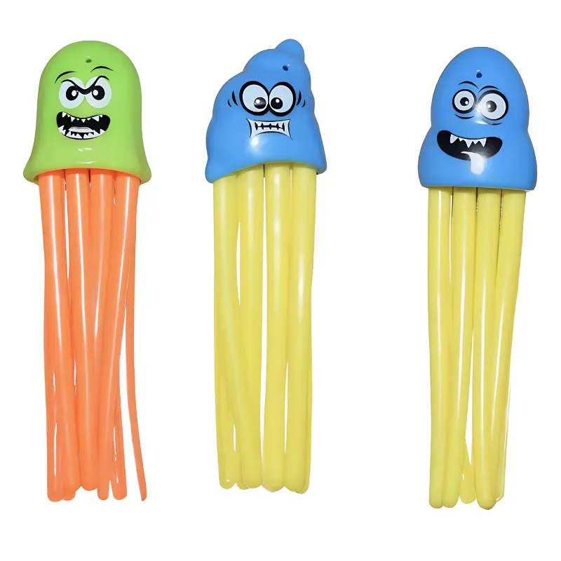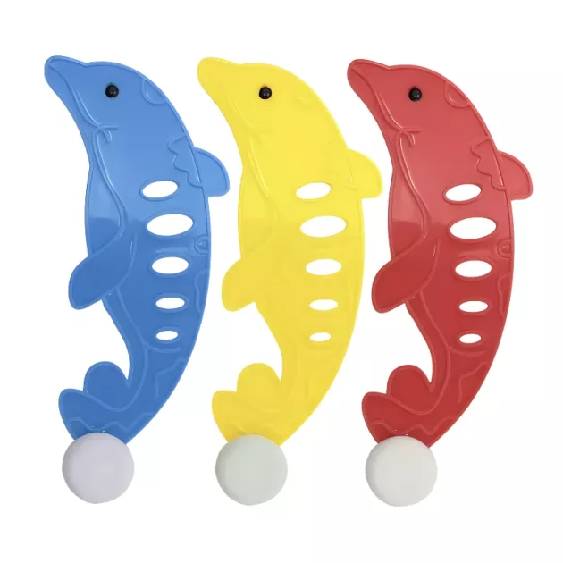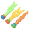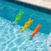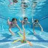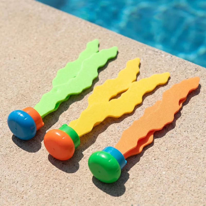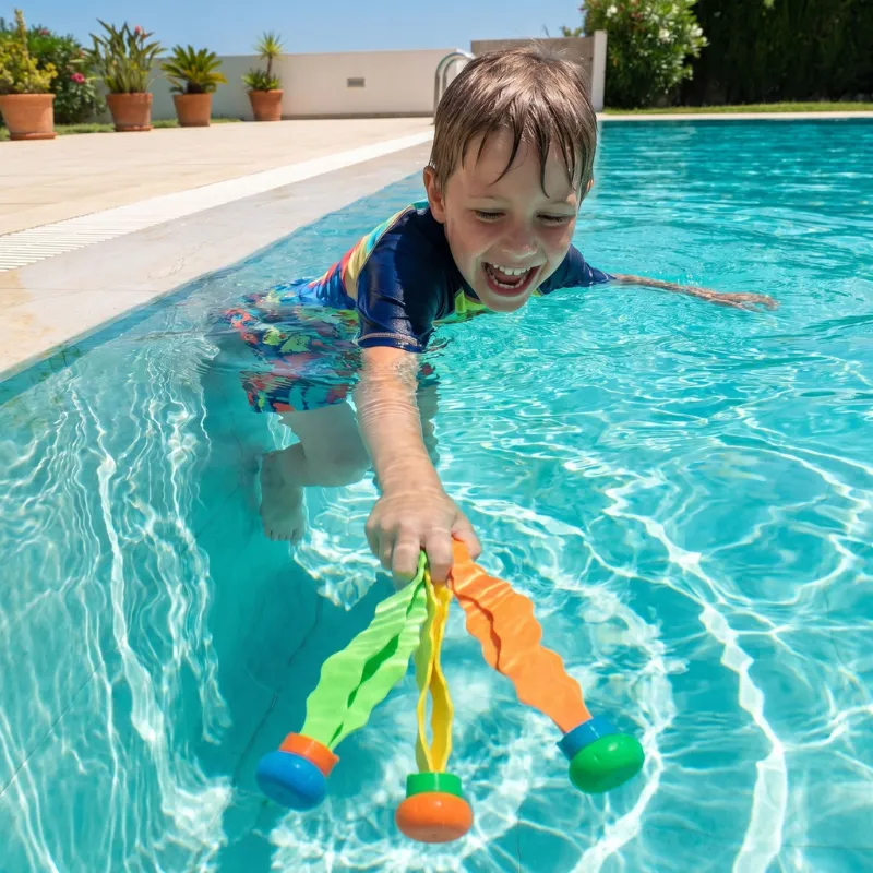 Tyttäreni uimavalmentaja ehdotti sukellusleluja, ja nämä toimivat hienosti. Hän yltää nyt syvän pään pohjaan ja nousee pintaan virne kasvoillaan joka kerta, kun nappaa yhden.