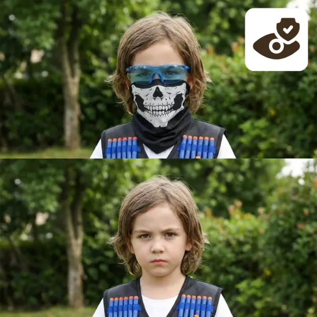 Täysi Turvallisuus - Suojaava naamio ja suojalasit suojaavat kasvot lentäviltä nuolilta. Vanhemmat voivat olla huoletta, kun silmät ja iho pysyvät turvassa ulkona.