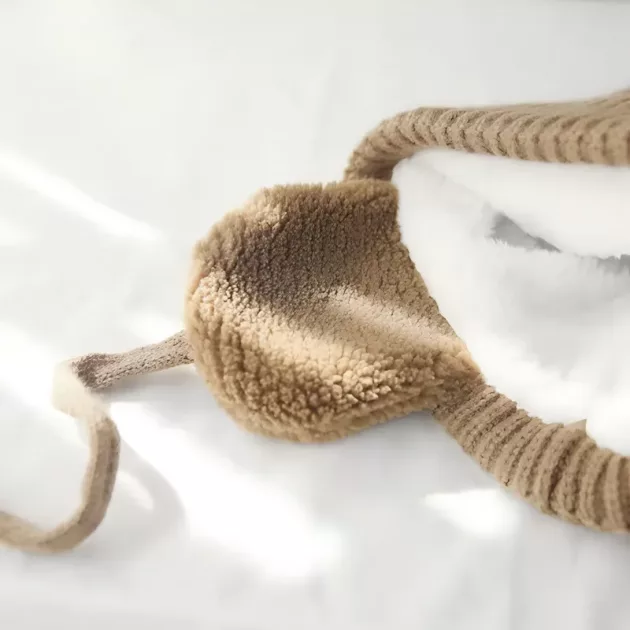 Rakastan, kuinka paksulta tämä tuntuu. Pitää lumen pois ja korvat lämpiminä. Nauhat ovat tarpeeksi helpot pienenkin sitoa.