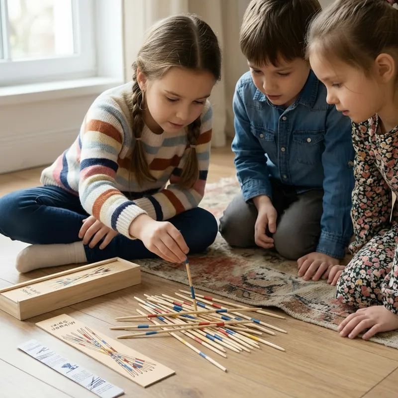Paras peli sadepäiville. Lapset pelaavat hiljaa, mutta naurua riittää aina, kun joku saa tikut liikkumaan!